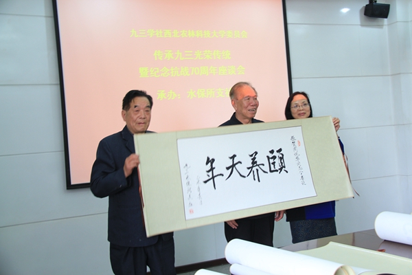 郑粉莉、王光陆代表全体九三社员为80岁以上的老社员代表周佩华、李银锄、刘向东、马秀梅、陈复城、陈一鄂、张淑焕、赵更生、姚振镐等赠送了字画。施立民为这些德高望重的社员致祝词,“九三同仁聚一堂,祝寿八旬先贤康,但愿尔辈身心健,人生旅径跃百年”。
