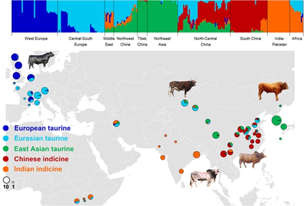 该研究对我国22个代表性地方品种的111头黄牛和8个陕西石峁遗址的4000年前的古代黄牛样品进行了全基因组重测序,同时下载比较了国外27个牛种的149个个体的全基因组数据。该论文首次证明全世界家牛至少可以分为五个明显不同的类群,即为欧洲普通牛、欧亚普通牛、东亚普通牛、中国南方瘤牛和印度瘤牛,其五类父系祖先被对应命名为Y1、Y2a、Y2b、Y3a与Y3b。中国黄牛地方品种来源于其中的三个血统,分别为约4000年前就到达中国北方地区,目前以纯系仅在青藏高原和东北地区存在的东亚普通牛;可能在1000年前进入中国北方,以蒙古牛和哈萨克牛为代表的欧亚普通牛;以及该论文新报道的与印度瘤牛早在四万年前就分离,具体来源和传播历史仍然未知的中国南方瘤牛。