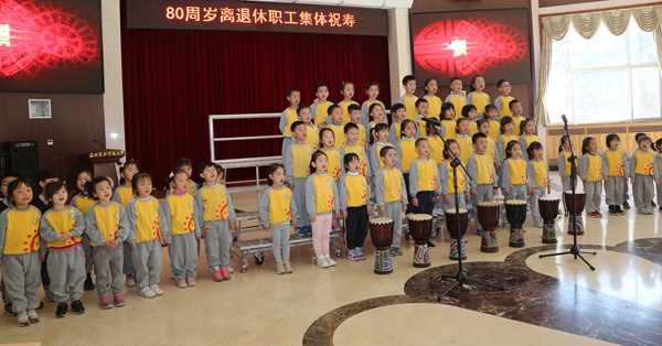 伴着欢快的乐曲,幼儿园小朋友表演了活力四射的啦啦操和歌曲大合唱《小宝贝》《看月亮爬上来》《四季的歌》,离退休职工表演了《丰收歌》,祝老同志们身体健康、阖家幸福。