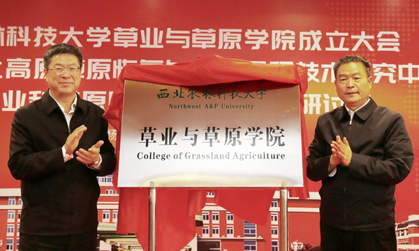 国家林业和草原局副局长彭有冬和校党委书记李兴旺为草业与草原学院揭牌