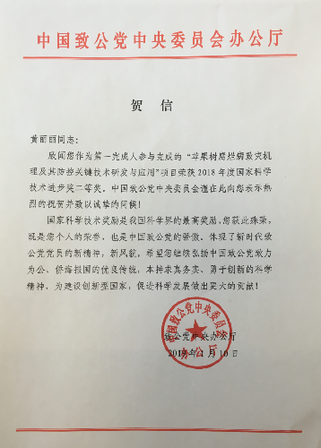黄丽丽教授收到贺信后表示,“作为一名普通的致公党员,取得的成绩能受到致公党中央肯定与祝贺,备受鼓舞,这让我感受到了致公党中央对于我们科研工作者的高度重视和关注,也让我拥有了在今后工作中取得更加优异成绩的信心和决心。”
