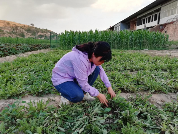 王渭玲在田地里查看中药材生长情况