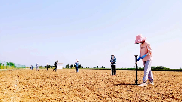 5月2日15时,玉米课题组杨琴教授带领11名研究生在官村试验站备播的田地里,顶着37℃烈日的炙烤,女生拉线,男生划行,沉重的划行器在男同学的手里变得轻巧、灵活,滴落的汗水汇进了一道道深浅相一而又横平竖直的播种线,像是在为迎接即将播下的“金种子”做洗礼。