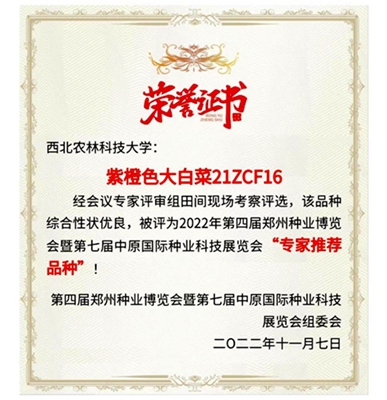 近日,张鲁刚教授团队选育的紫橙色大白菜21ZCF16在2022年第四届郑州种业博览会暨第七届中原国际种业科技展览会上被评为专家推荐品种。